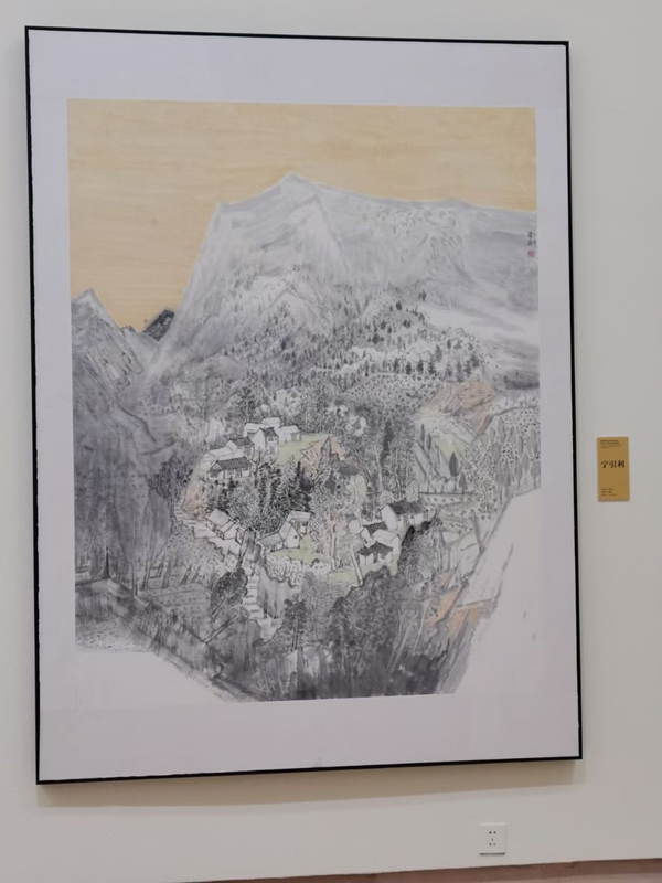 这幅画的空间布局也藏着画家的巧思。近景的山谷用浓墨反复渲染,一层叠一层的墨色像云雾翻滚,把秦岭山谷的幽深安静展现得淋漓尽致;中景的村落和树木用中等浓度的墨铺画,通过线条疏密、墨色深浅区分屋舍、树木、田埂,让村落布局错落有致,仿佛是从山水中自然长出来的一样;远景的山峰只用淡墨轻轻勾勒,笔锋慢慢变浅,墨色渐渐变淡,最后和上方的金色天际融为一体,形成了“近景浓墨打底、中景淡墨铺陈、远景金辉映衬”的三层视觉效果。这种从浓到淡、从实到虚的布局,不仅把秦岭的广阔和深远放大了,让观者的视线能从近景山谷一直延伸到天际山峰,就像站在陈仓大地上抬头看秦岭的真实感受;更让宏大的山水画面落到了日常烟火里——巍峨秦岭是背景,村落才是故事的核心,山河的气势和家乡的温暖完美融合,也让这幅画不只是简单描摹山水,更生动诠释了“一方水土养一方人”的道理。