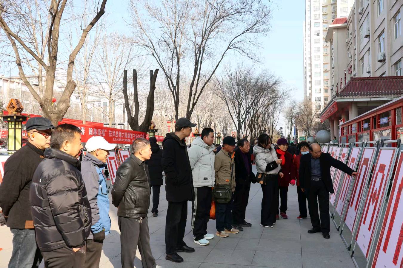 义写活动从九点开展,持续进行到中午饭前,现场领纸队伍排成长龙,义写方阵簇拥成堆,凉晒场面火辣一片,市民中心门前人山人海热烈非凡,群众争先恐后赞声沸扬。举办方为烘染活动气氛,增添祥和美好的文化内容,展示扶风春联书写者的艺术风采,同时举办了第六届春联书法作品展。翟功印主席在义写前同义写会员与群众一齐参观展览,并向大家对40面展牌上的春联书法作品作了一一讲解与分享。