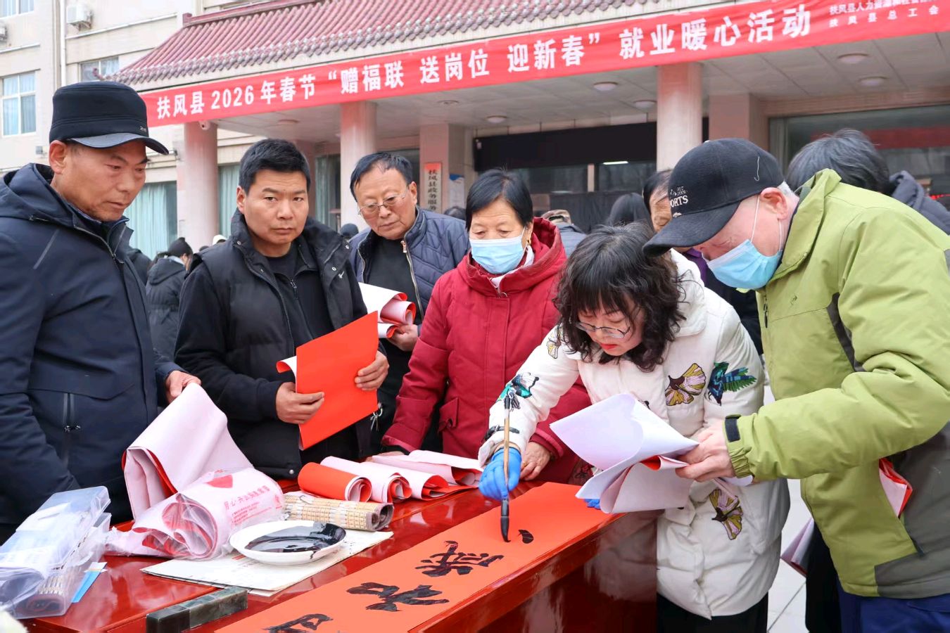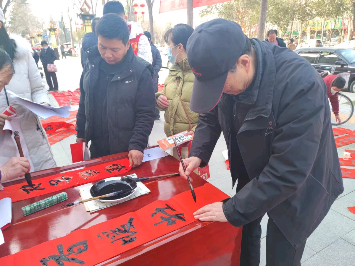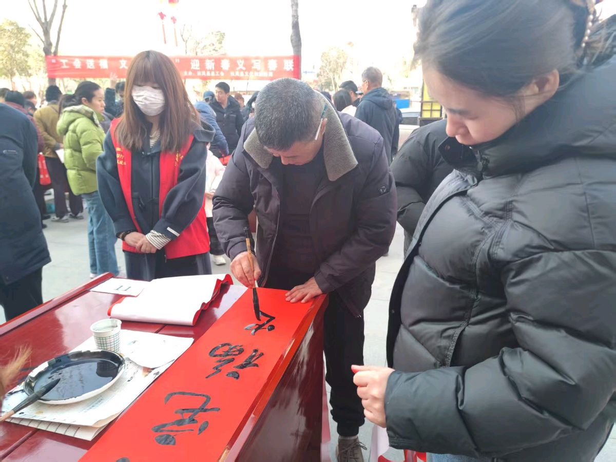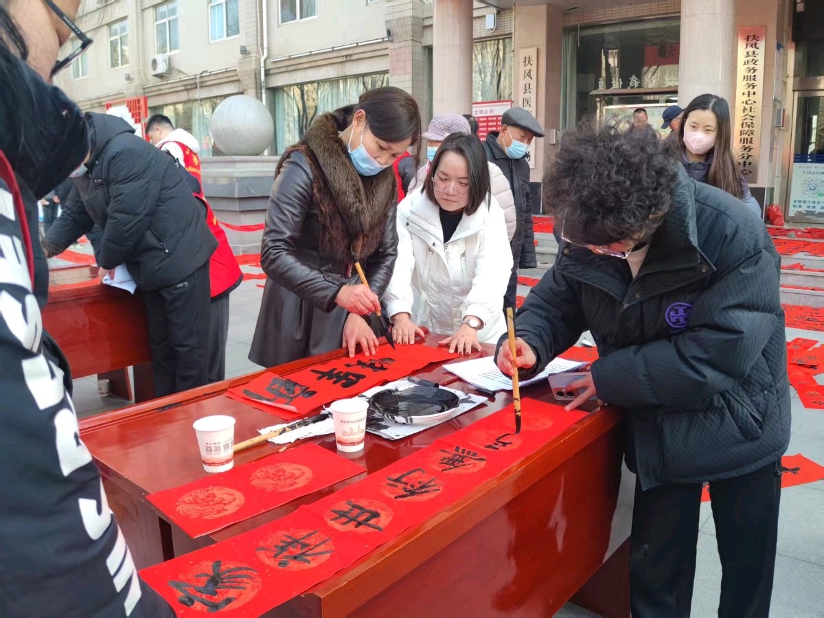 本网讯:(周原子 报道)2026年2月9日(腊月二十二日)上午,“强基工程”2026新春特别行动——“工会送福 文旅添彩”迎新春义写春联活动暨“骏马迎春 翰墨颂福”扶风县第六届春联书法作品展在市民中心大门前广场举行。扶风县总工会、县税务局、县文化和旅游局、宝鸡市楹联学会主办,扶风县图书馆、县书法家协会承办。